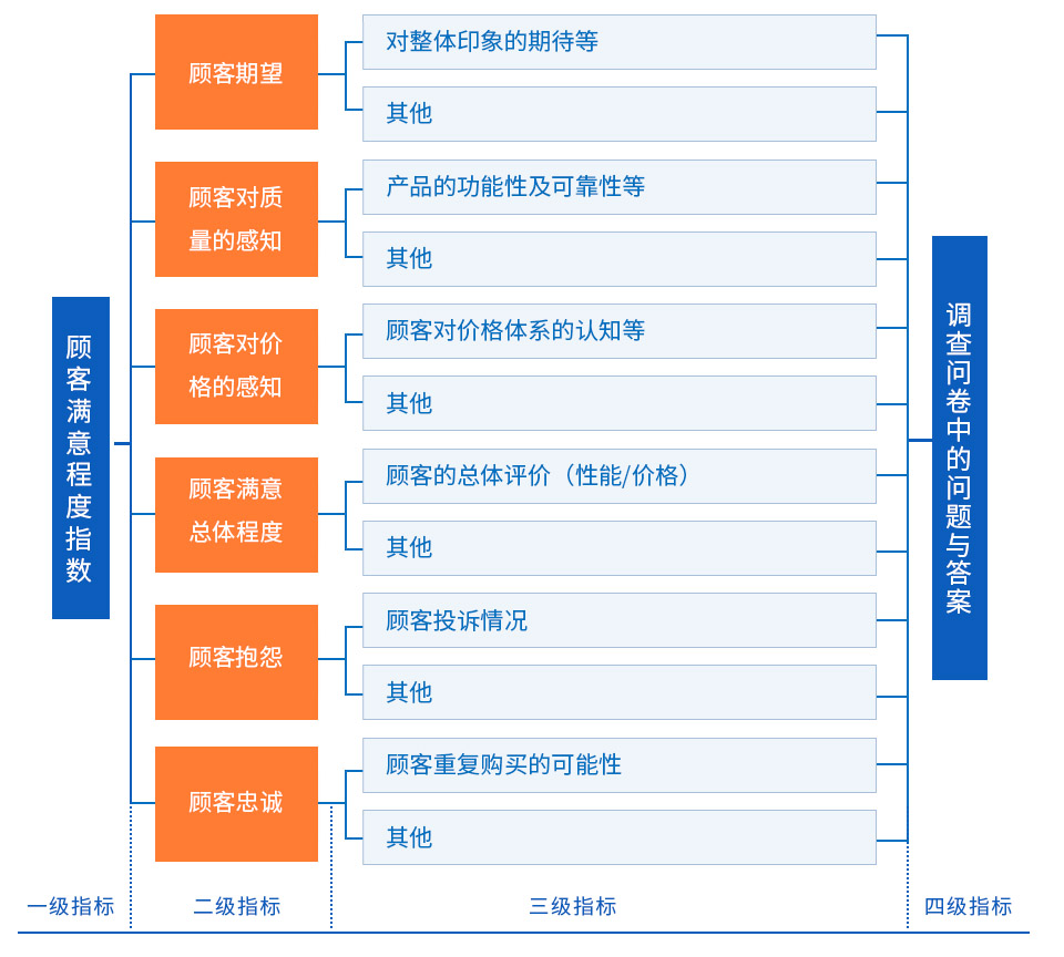 顧客滿意度指標,簡稱CSI(ConsumerSatisfactionIndex),它是顧客滿意度研究中一個非常有效的度量和認識顧客對企業的認同、對產品和服務的滿意程度,以及再次購買傾向的指標。這種指標通過測量顧客對產品或服務的期望、質量認知、價值認知和滿意程度,測量決定滿意度的相關變量和形成的忠誠度等幾個方面,從多個角度對產品或服務質量進行整體評價。CSI指標體系劃分為四個層次。顧客滿意度每一層次的測評指標都是由上一層測評指標展開的,而上一層次的測評指標則是通過下一層的測評指標的測評結果反映出來的,其中“顧客滿意度指數”是總的測評目標,即一層次;顧客滿意度模型中的顧客期望、顧客對質量的感知、顧客對價值的感知、顧客滿意度、顧客抱怨和顧客忠誠等六大要素作為二級指標,即第二層次;根據不同的產品、服務、企業或行業的特點,可將六大要素展開為具體的三級指標,即第三層次;三級指標可以展開為問卷上的問題,形成了測評指標體系的四級指標,即第四層次。