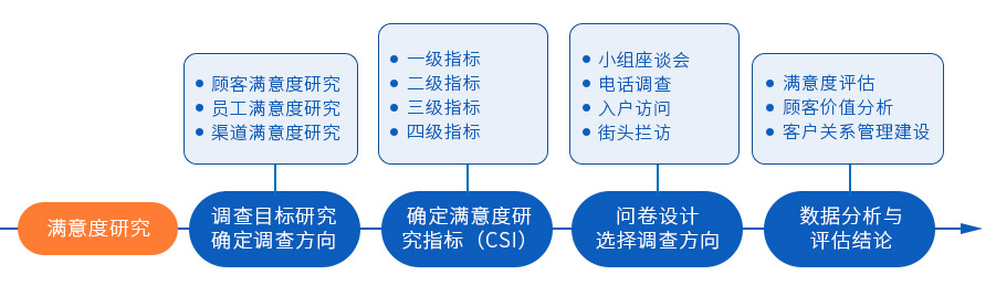 客戶滿意度研究(Consumer Satisfaction Research,簡稱CSR)是指通過對影響被測量對象滿意度的因素進行分析,獲得客戶對產品銷售、使用、售后等各個環節的滿意度指標評價,發現影響滿意度的因素、滿意度及消費行為三者的關系,通過優化成本,有效的提升影響滿意度的關鍵因素,改變消費者行為,建立和提升忠誠度,達到減少抱怨和流失,增加重復性購買行為,創造良好口碑,提升企業的競爭能力與盈利能力的一種研究方法。