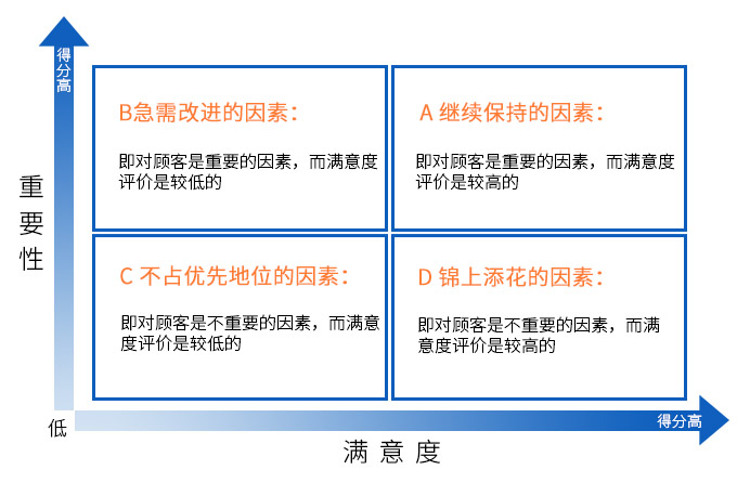 通過(guò)顧客對(duì)因素重要性的評(píng)價(jià)和滿意度評(píng)價(jià),能夠區(qū)分出四種類型的因素,同時(shí)對(duì)企業(yè)或服務(wù)進(jìn)行分析得出: