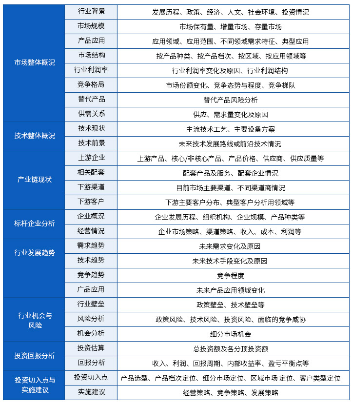 可行性研究的內容包括行業宏觀研究、微觀運營分析、未來趨勢研究、機會風險分析、投資可行建議和市場切入建議等六個方面。通過行業宏觀研究對市場整體情況進行宏觀梳理;通過微觀運營分析對產業鏈(上游、中游企業及配套方、下游)進行分析;通過未來趨勢研究判斷未來行業發展的趨勢;通過機會風險分析判定行業機會、壁壘、風險;投資可行分析從財務角度進行投資可行性、投資回報測算;市場切入建議是通過分析投資切入口,給出相關落地建議。